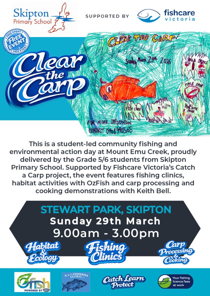 Hello everyone, we are Grade 5/6 2026 at Skipton Primary School. Last year, our class organised a fishing competition, ‘Clear the Carp’, which saw 81 registered anglers remove 32 carp weighing 45 kg from the creek. So, partnered with the Stewart Park Committee of Management and supported by Fish Care, Oz Fish, and the Upper Mount Emu Creek Landcare Network, we are doing it again on Sunday, the 29/03/2026, from 9:00 AM to 3:00 PM at Stewart Park, Skipton.